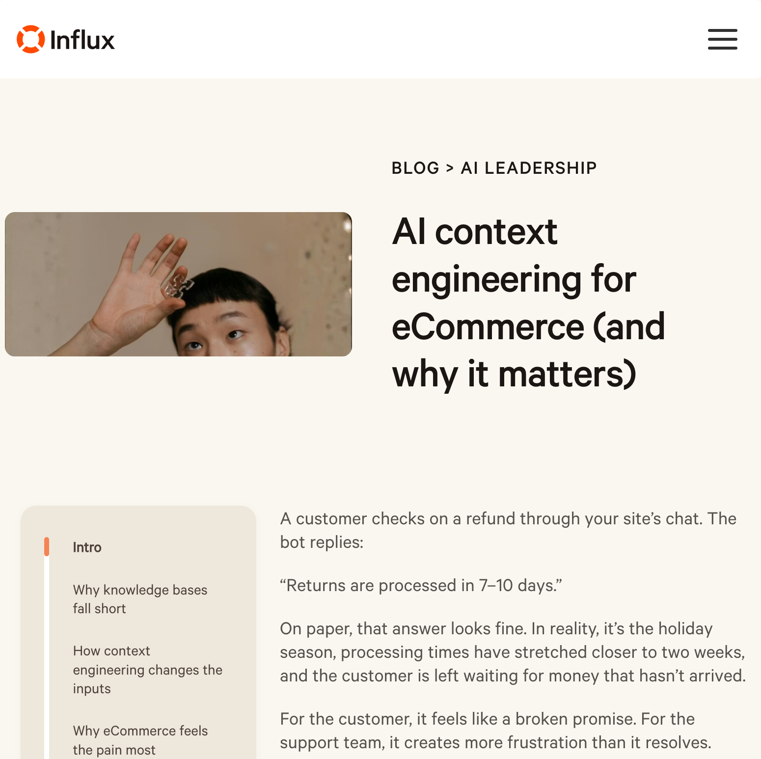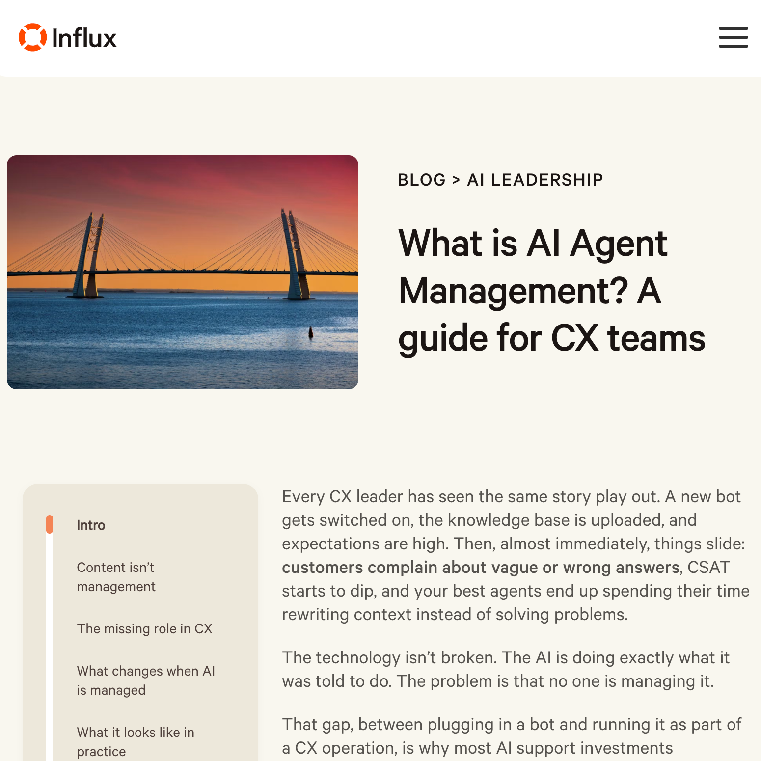 The AI Agent Management landing page was the first piece. The challenge was positioning: this product sits in a space most people haven't considered. I wrote the page to lead with the problem (AI agents plateau without continuous management) and then make Influx's solution feel both obvious and differentiated.