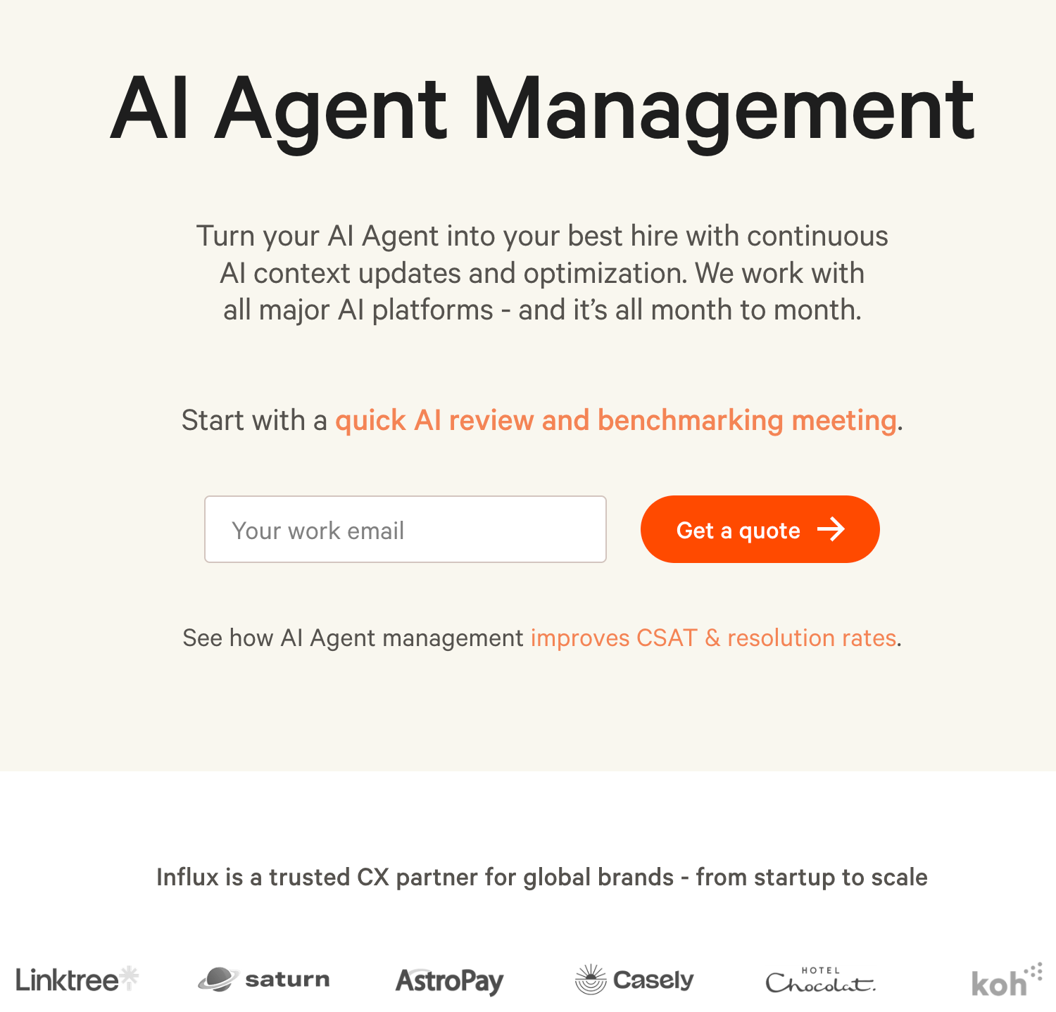 Influx is a customer experience platform that helps global brands build fast, flexible support teams. They'd built something genuinely new: a service that puts a dedicated human in charge of managing and optimising the AI support agents their clients already use. Not AI itself. Not human support. The layer in between that determines whether AI actually performs.